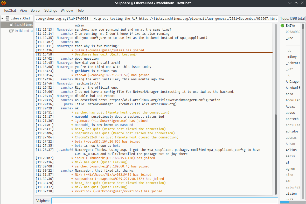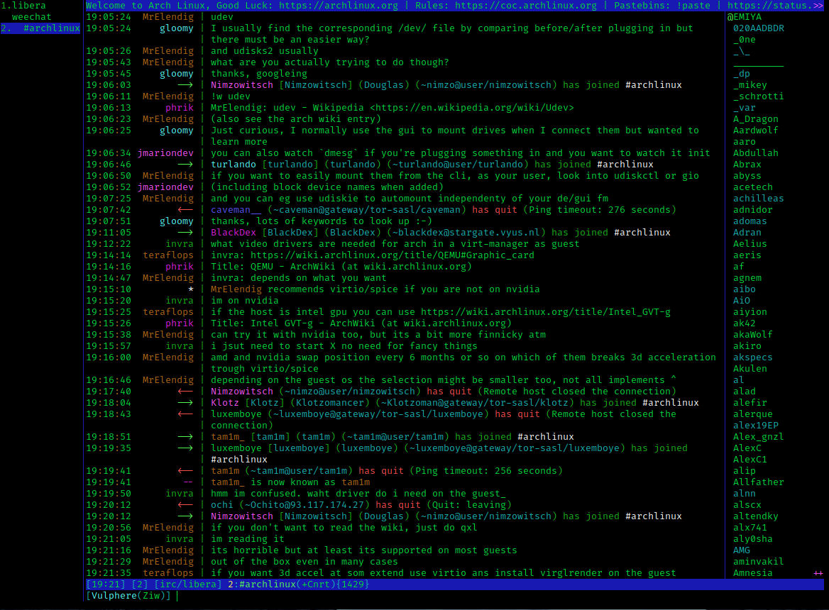 Grab a IRC client and connect to irc.velatus.net, port 6697. Some IRC clients, like mIRC (Windows), require a plus sign (+) before the port (+6697), to use IRCS (TLS/SSL) capabilities. Refer to specific client’s documentation, to add networks/servers, configure nicknames etc.
