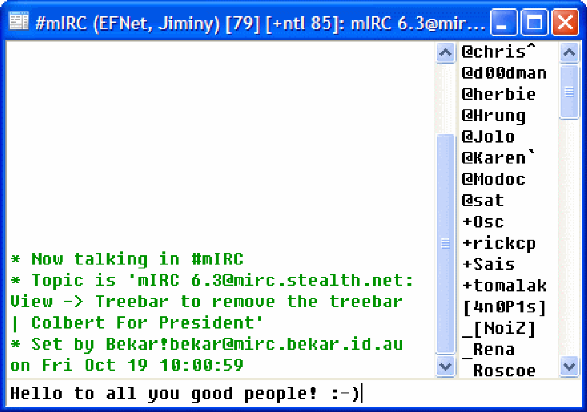 On channel, you will see a list of users. Some of those users will have special characters, like “@”, “%” or “+” in front of their nicknames. Those are channel operators, channel half-operators and voiced users. Channel operators can change channel topics, chage channel modes and kick and ban other users on channel. Voiced users (voices) are trusted users, who have a say about channel doings, but they cannot kick or ban anyone. They are also able to speak in channel, when mode  +m/+M (moderated) is set on a channel or they are banned, while still on channel.